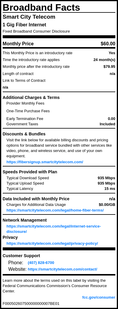 Broadband labels are similar to the nutrition facts you see on food packaging. They provide consumers with clear and concise information about broadband services, making comparing different providers and plans easier. These facts typically include prices, introductory rates, data allowances, broadband speeds, network management practices, privacy policies, and information about the FCC’s Affordable Connectivity Program.